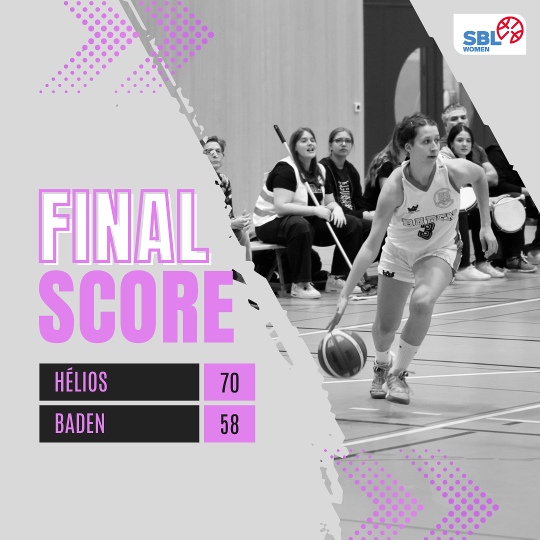 Im zweiten Viertel konnte etwas Schadensbegrenzung begangen werden, doch Hélios führte zur Halbzeitpause noch immer 40:34. Im dritten und vierten Viertel gelang es den Badenerinnen weiterhin nicht, ihre beste Leistung abzurufen, weshalb es schlussendlich nicht für den Eklat zum Schluss reichte. Somit verliert Baden auswärts in Sion 58:70 und bleibt vorerst auf dem achten Tabellenrang.