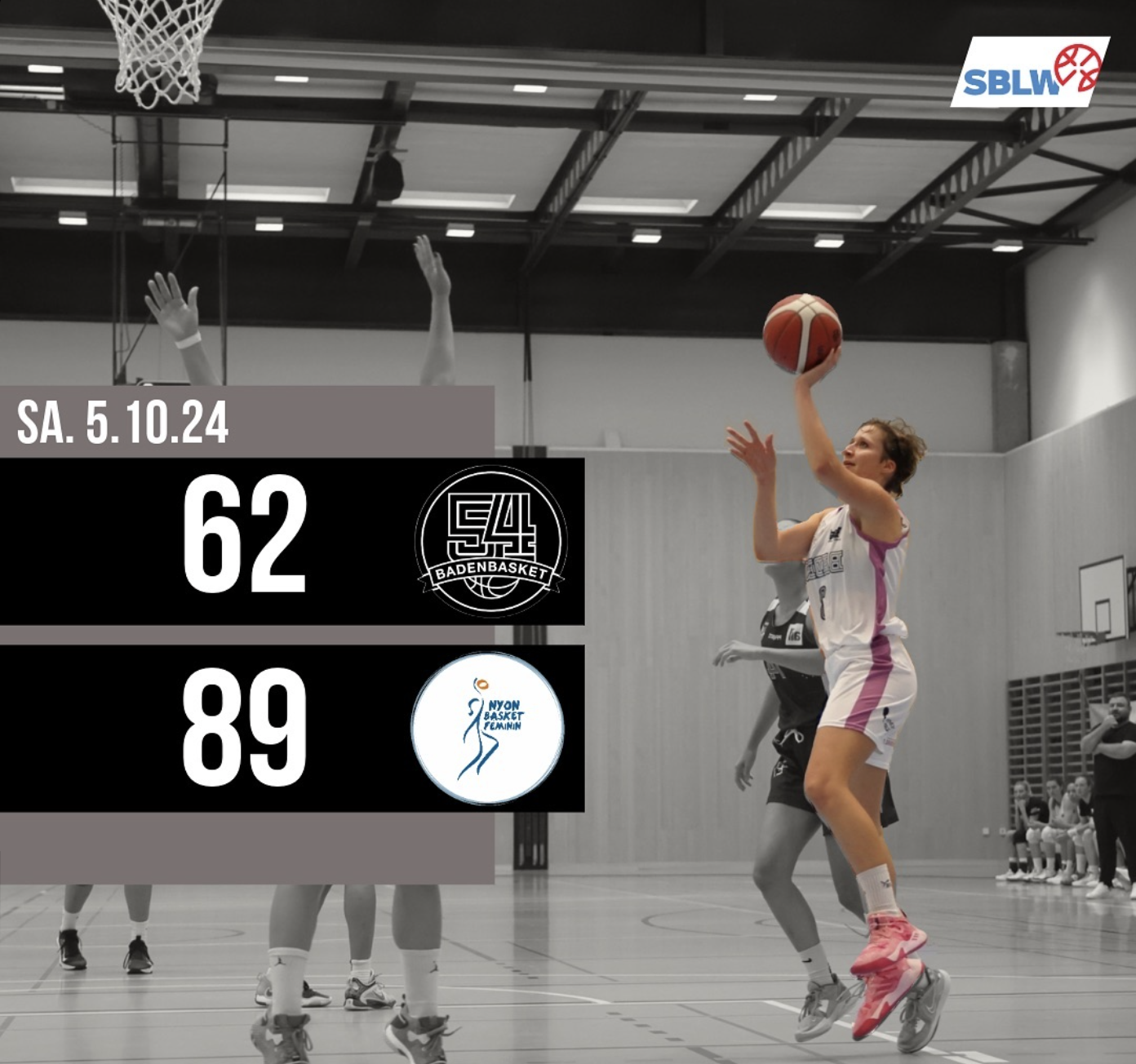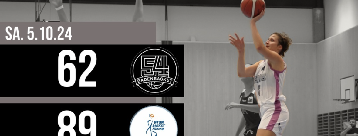 Das Spiel startete ausgeglichen. Baden hielt gut mit mit den Gästen aus Nyon. Nach 10 Minuten stand es 22:20 für Nyon. Bis zur Halbzeitpause konnte sich Nyon etwas absetzen. Baden bekundete Mühe mit den Back Door Cuts der kleinen und den Dreipunktewürfen der grossen Gegnerinnen. Im Angriff zeigte man jedoch gute Aktionen und ging mit einem aufholbaren 36:46-Rückstand in die Halbzeitpause.