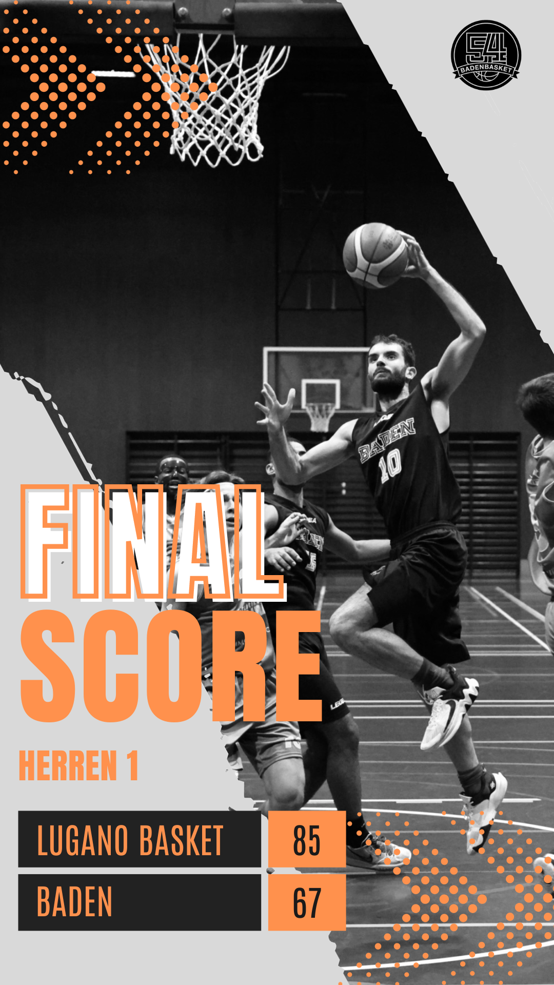 Leider änderte sich das Bild im Schlussviertel, als die Lugano Tigers ihre Führung ausbauten und letztendlich mit 85-67 gewannen. Trotz der Niederlage zeigte Baden Basket 54 Herren 1 kämpferischen Einsatz und Teamgeist während des Spiels.