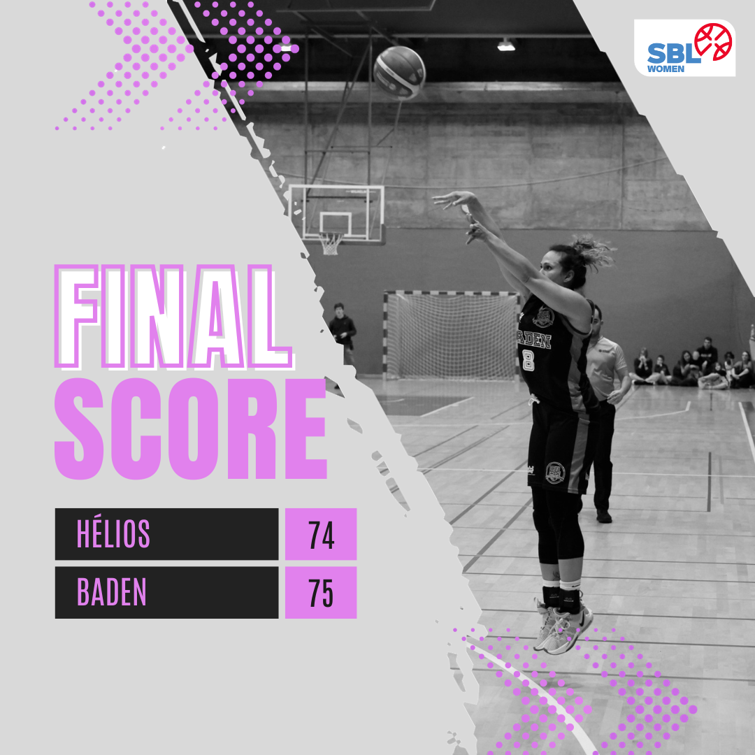 Das vierte Viertel startete und Hélios drehte aut. Sie vollbrachten einen 13:0-Run, welcher fast einen Flashback an das letzte Spiel gegen Troistorrents hervorrief. Dieses Mal konnten sich die Badenerinnen jedoch aus der Paralyse befreien und legten in den letzten sechs Minuten zur Aufholjagd los. Es gelang der Turnaround von -9 auf +3 Punkte und dies, obwohl man seit der zweiten Minute im vierten Viertel mit Teamfouls zu kämpfen hatte. Nach einem langen Hin und Her an der Freiwurflinie konnten die Badenerinenen das Spiel schlussendlich knapp mit einem Punkt Vorsprung über die Runden retten. Das Spiel endete knapp, aber verdient 75:74 für Baden.
