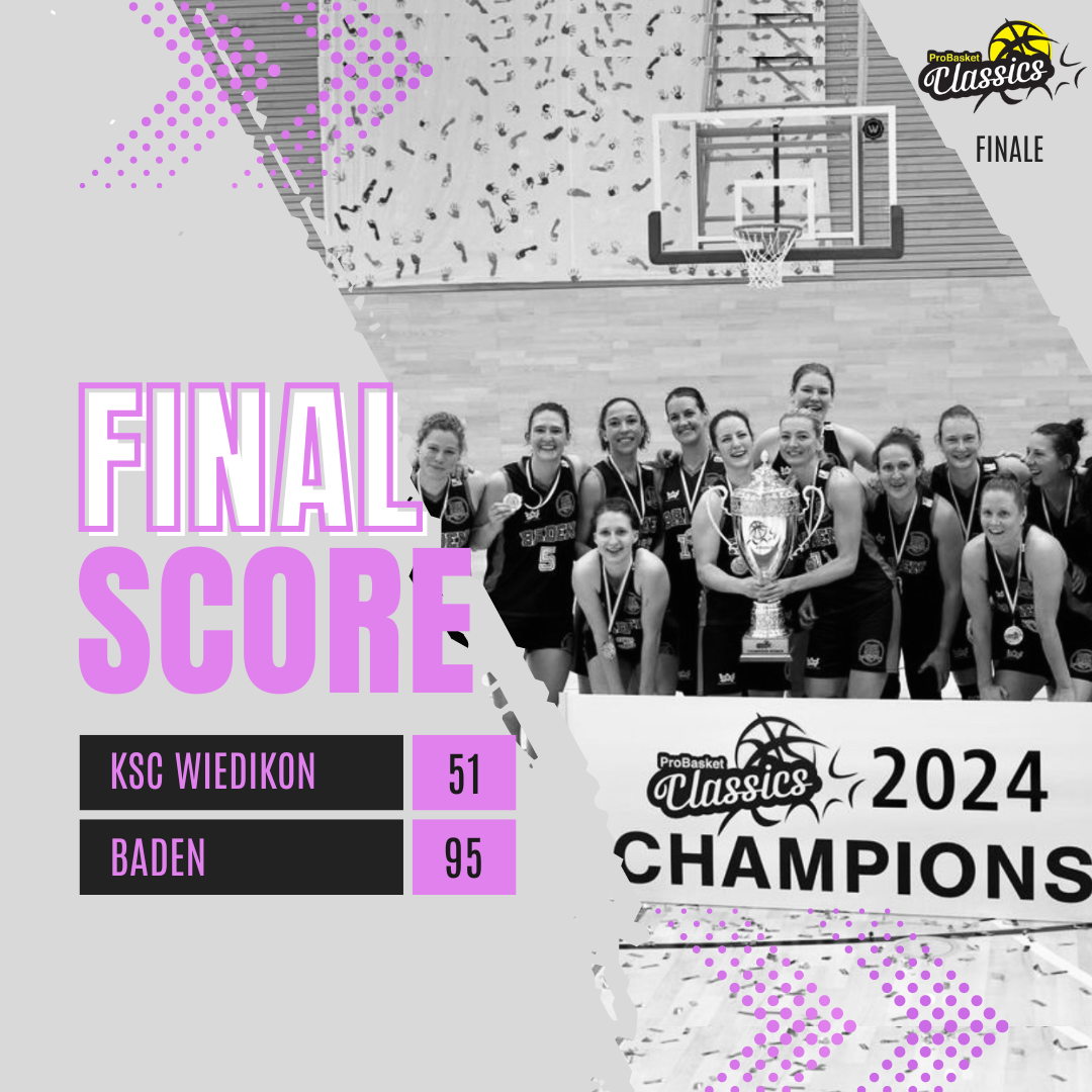 Nach der Pause zeigten die Badenerinnen wieder ihre Dominanz. Dies durch eine konstante und sichere Verteidigung, welche schnelle Gegenangriffe für Baden nach sich zogen und viele schön herausgespielte Würfe aus der Distanz. Der Abstand konnte in der zweiten Hälfte stets ausgebaut werden, bis das Spiel zum Schluss deutlich 95:51 für Baden endete. Die Badenerinnen schliessen somit die Saison 2023/24 als Cupsieger im Probasket Classics Cup! 💪🏀🏆🎉